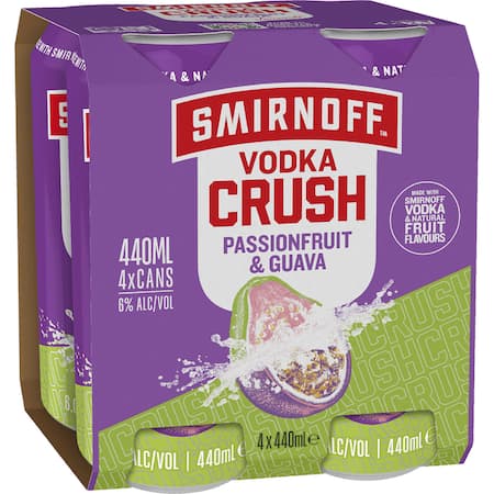 Get Smirnoff Vodka Crush Passionfruit & Guava Cans 440mL x 4 pack delivered to your doorsteps in minutes | AU
